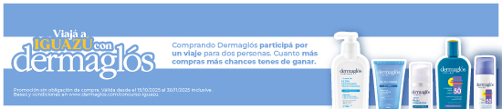 Comprando cualquier producto de nuestra marca Dermaglós participas de un sorteo por un viaje para dos personas a Iguazú. Cuanto más comprás, más chances de ganar tenes. Promoción válida desde el 15/10/2025 hasta el día 30/11/2025.